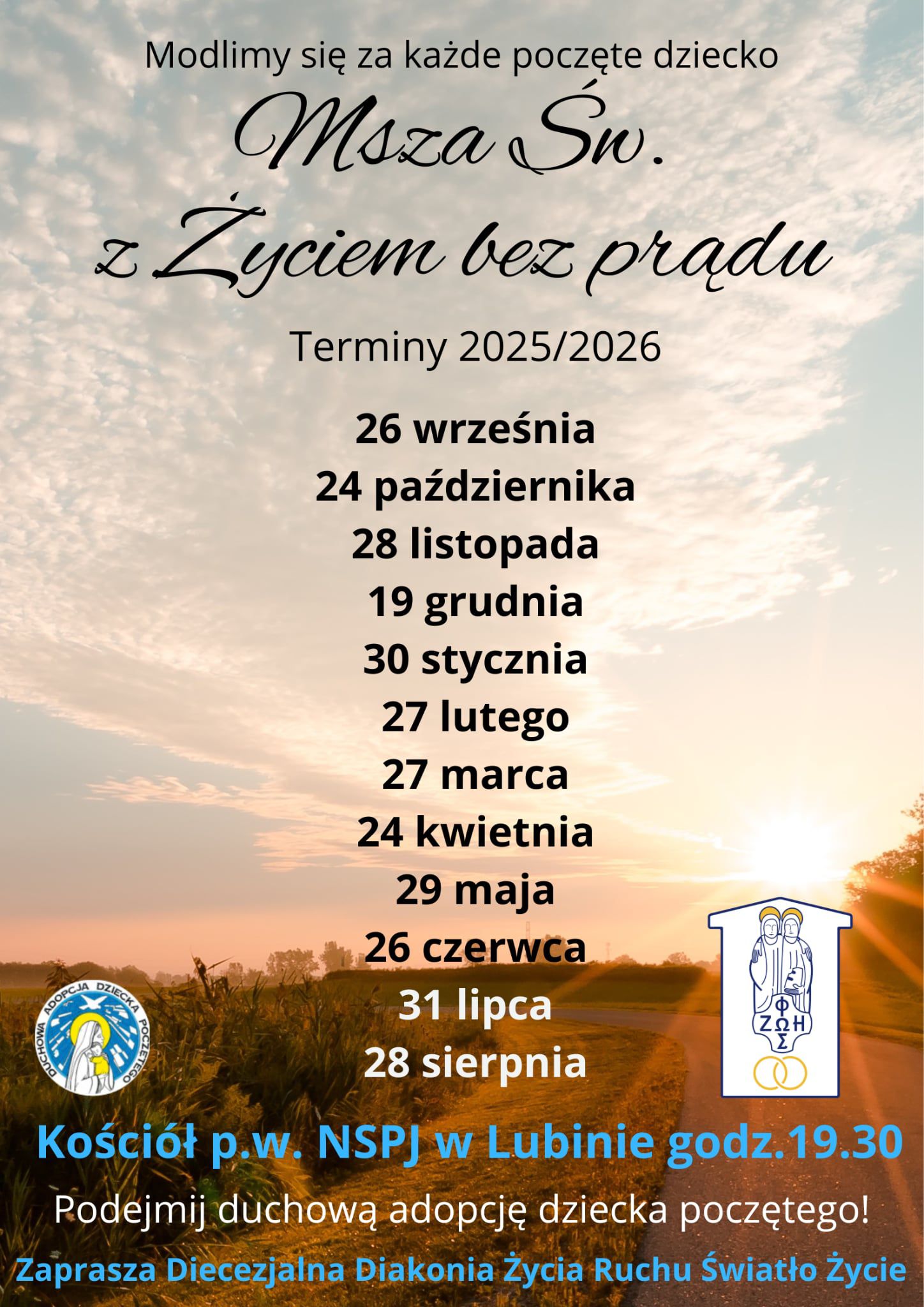 Parafia Najświętszego Serca Pana Jezusa w Lubinie zaprasza na Msze Święte „bez prądu” w intencji każdego poczętego życia. W czasie Mszy Świętych jest możliwość podjęcia Duchowej Adopcji Dziecka Poczętego.