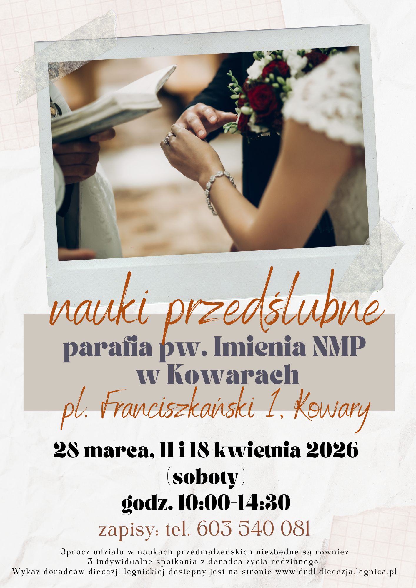 Nauki przedślubne w parafii pw. Imienia NMP w Kowarach odbywać się będą w 3 soboty listopada: 28 marca, 11 i 18 kwietnia 2026, od 10.00 do 14.30. Na spotkania zapraszamy do salki przy klasztorze oo. Franciszkanów w Kowarach.