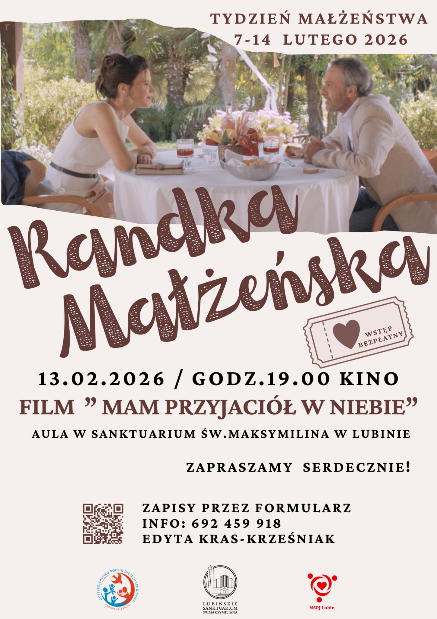 Z okazji Międzynarodowego Tygodnia Małżeństwa parafia NSPJ w Lubinie, Sanktuarium św. Maksymiliana w Lubinie oraz Duszpasterstwo Rodzin zaprasza serdecznie na małżeńską randkę kinową.
