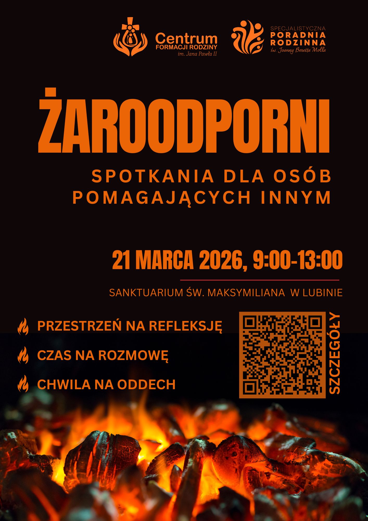 Centrum Formacji Rodziny im. św. Jana Pawła II w Lubinie oraz Specjalistyczna Poradnia Rodzinna im. św. Joanny Beretta Molla zapraszają na spotkanie „Żaroodporni” adresowane do osób, które na co dzień pomagają innym: psychologów, terapeutów, pedagogów, nauczycieli, osoby duchowne, pracowników służby zdrowia, pracowników socjalnych i osoby działające w NGO, wolontariuszy, osoby pracujące z potrzebującymi.