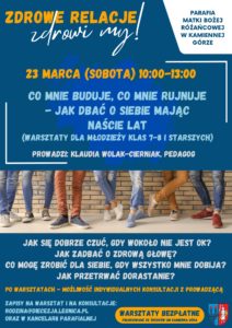 Parafia pw. Matki Bożej Różańcowej w Kamiennej Górze zaprasza na spotkanie „Co mnie buduje, co mnie rujnuje – jak dbać o siebie, mając naście lat?”, które poprowadzi pedagog, doradca rodziny, trener umiejętności społecznych pani Klaudia Wolak-Cierniak. Warsztaty są adresowane do młodzieży z klas 7 i 8 SP.