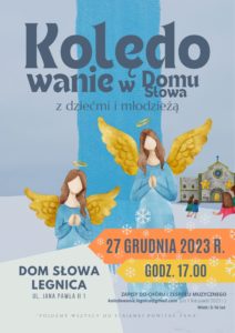 W środę 27 grudnia 2023 roku o 17:00 w DOMU SŁOWA w Legnicy odbędzie się wspólne kolędowanie. Poprowadzi je przygotowany specjalnie na tę okazję zespół wokalno-muzyczny, w skład którego wchodzą rodzice, młodzież i dzieci. Po kolędowaniu na wszystkich będzie czekał słodki poczęstunek. Każdy jest mile widziany!