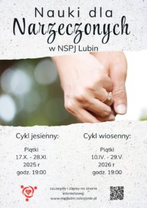 Nauki przedślubne w parafii Najświętszego Serca Pana Jezusa w Lubinie odbywają się w piątki, od 10 kwietnia do 29 maja 2026, o godz. 19.00 w sali nr 6 na Plebanii (obok kancelarii) lub w auli Salezjańskiego Liceum Ogólnokształcącego. Zapisy odbywają się za pomocą formularza, umieszczonego na stronie parafii: www.nspjlubin.salezjanie.pl/?page_id=65