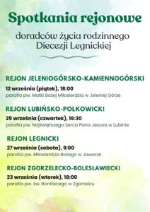 We wrześniu w rejonach spotykają się doradcy życia rodzinnego, aby wspólnie uczestniczyć w Eucharystii, modlić się, rozmawiać i inspirować. Udział w spotkaniach prosimy potwierdzać u organizatorów – doradców rejonowych.